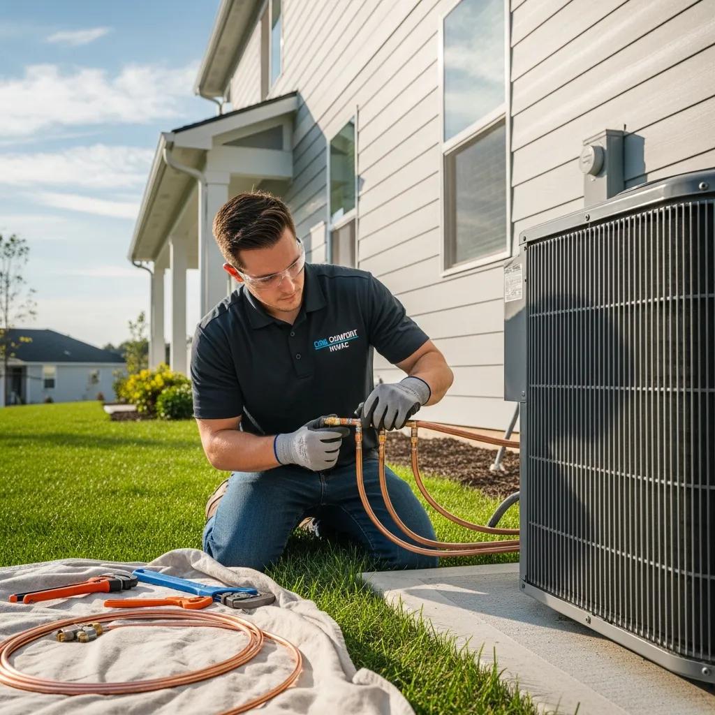 - Outdoor Unit Installation: The condenser unit is placed on a level pad outside your home, ensuring proper clearance for airflow, maintenance, and optimal performance.
